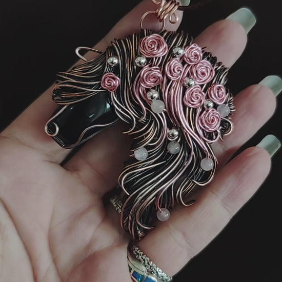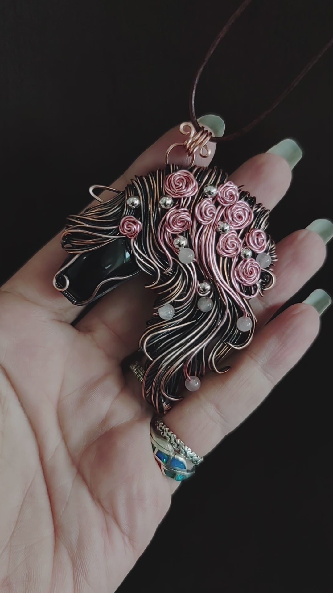 Horse Lovers dream, Beautiful Rose Parade 🌹🌸pony pendant with long mane featuring a  gorgeous black obsidian Stone and rose quartz  and silver beads plus a  handmade pink roses.